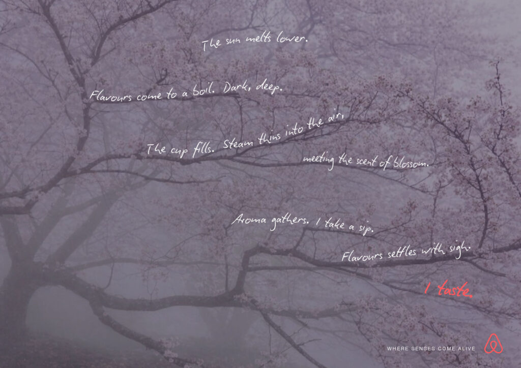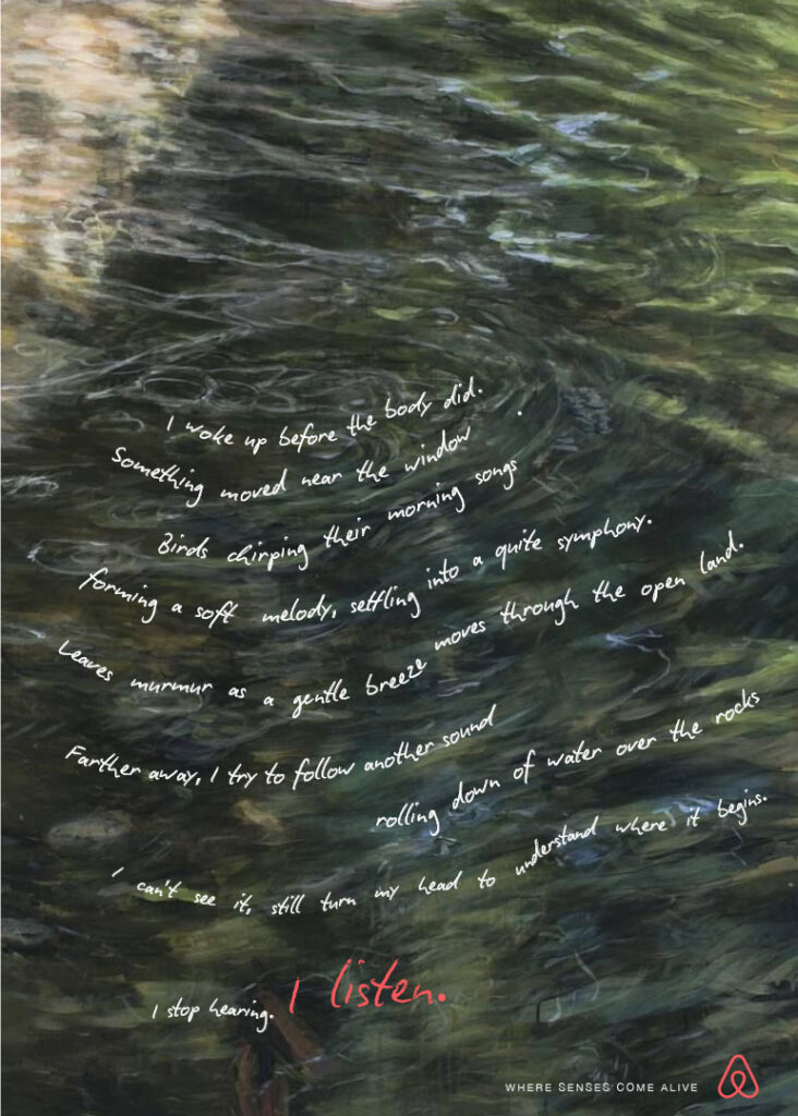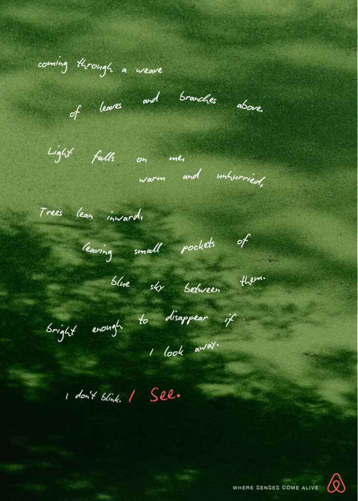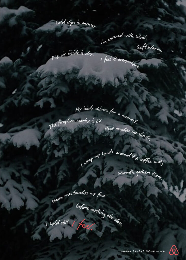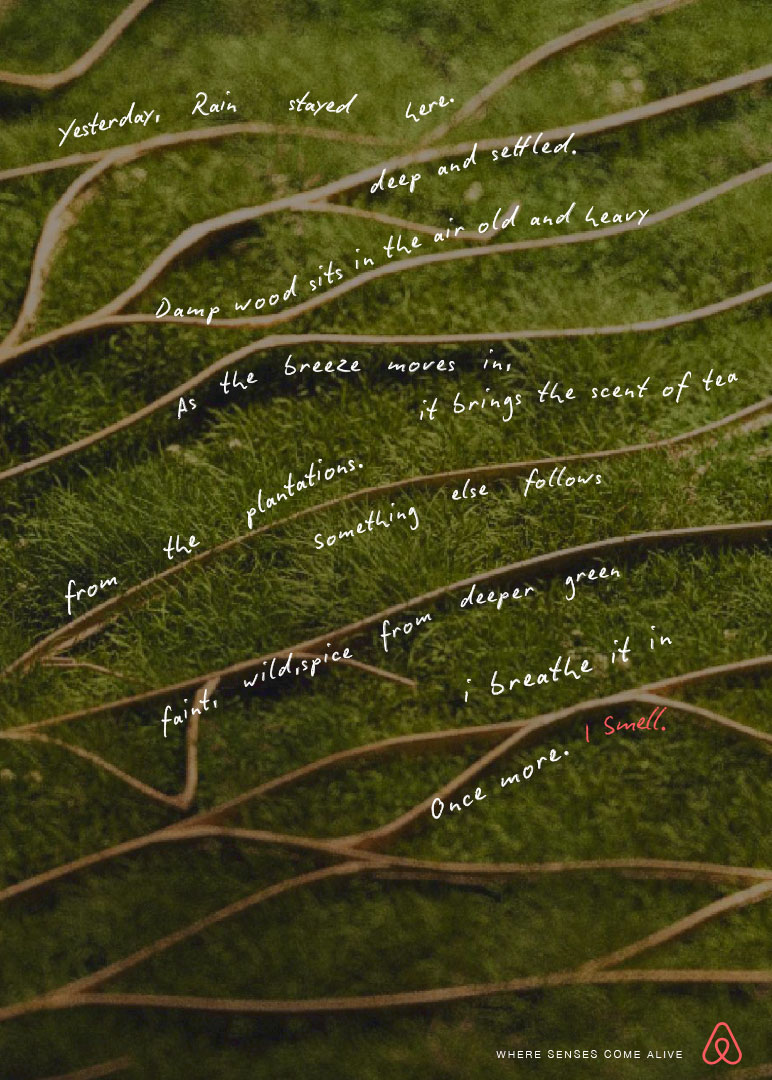 Airbnb offers curated remote stays nestled deep within nature, where the surrounding environment can be experienced through all the senses. The idea is to highlight these sensory moments and helping people notice and reconnect with experiences they often overlook in the rush of urban life.