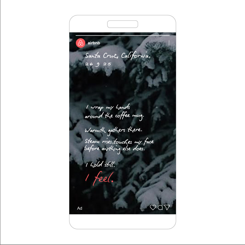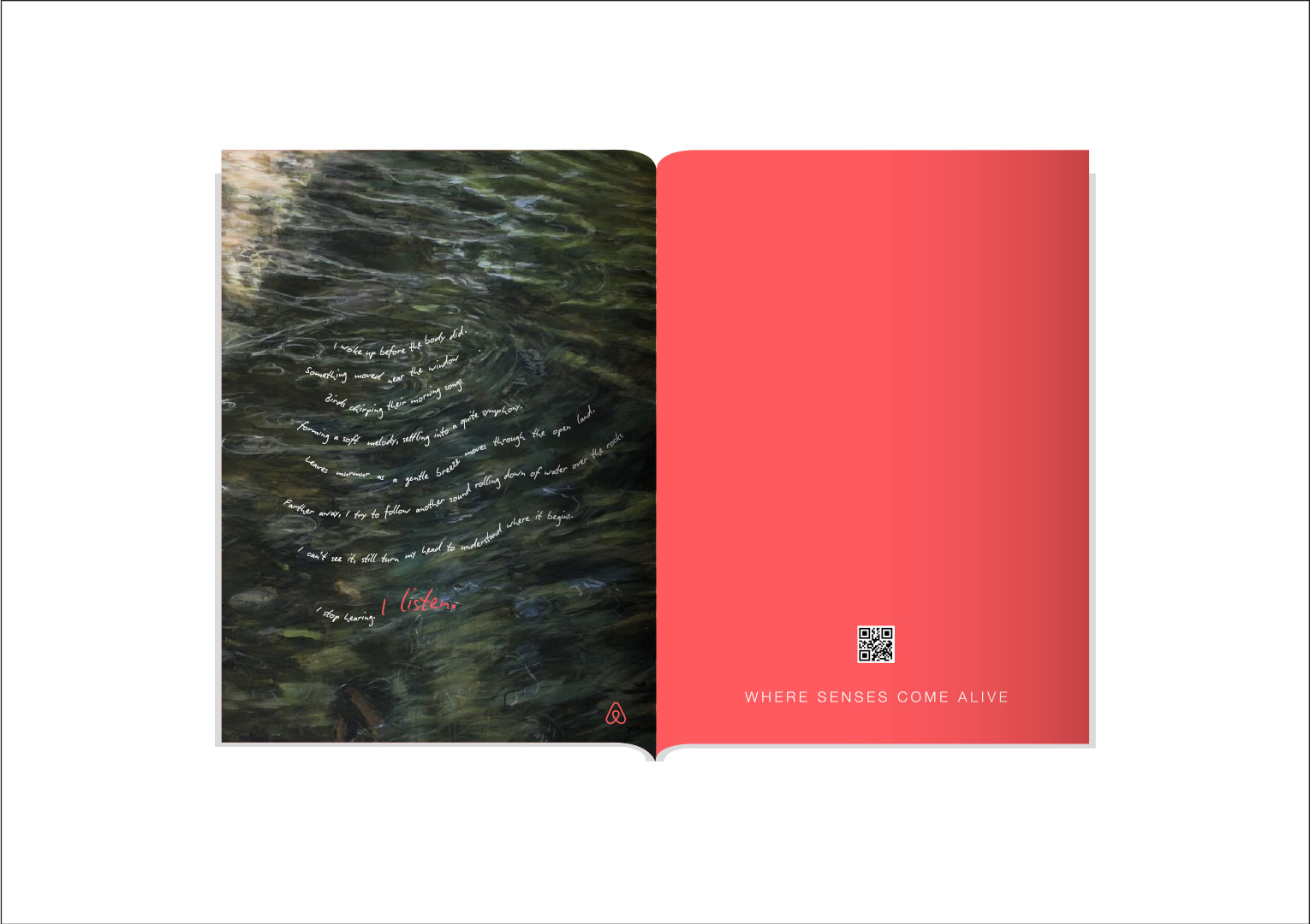 The sensory experiences of Airbnb’s remote stays were observed as individual moments like natural soundscapes, fresh open air, raw natural textures, subtle flavors . These moments were written as raw narratives and translated into visual compositions that feel immersive, authentic, and deeply rooted in nature.