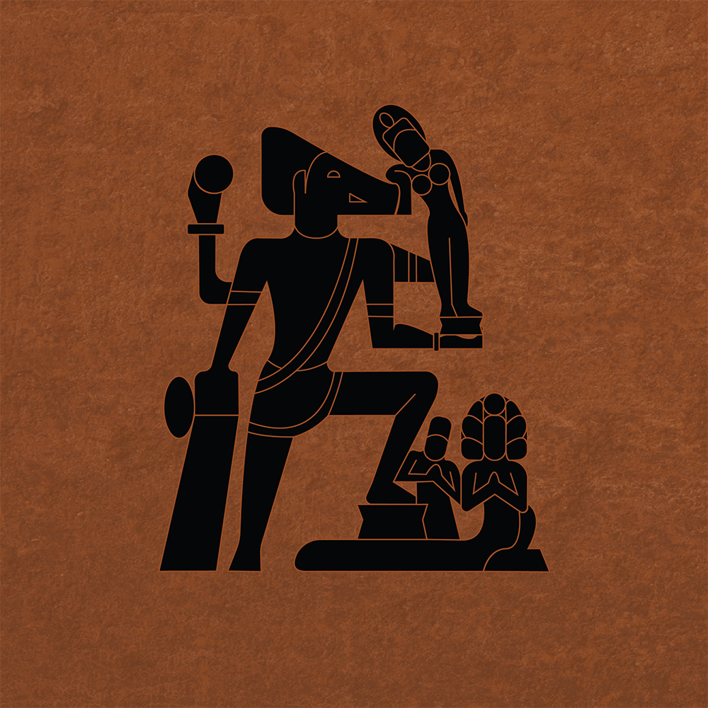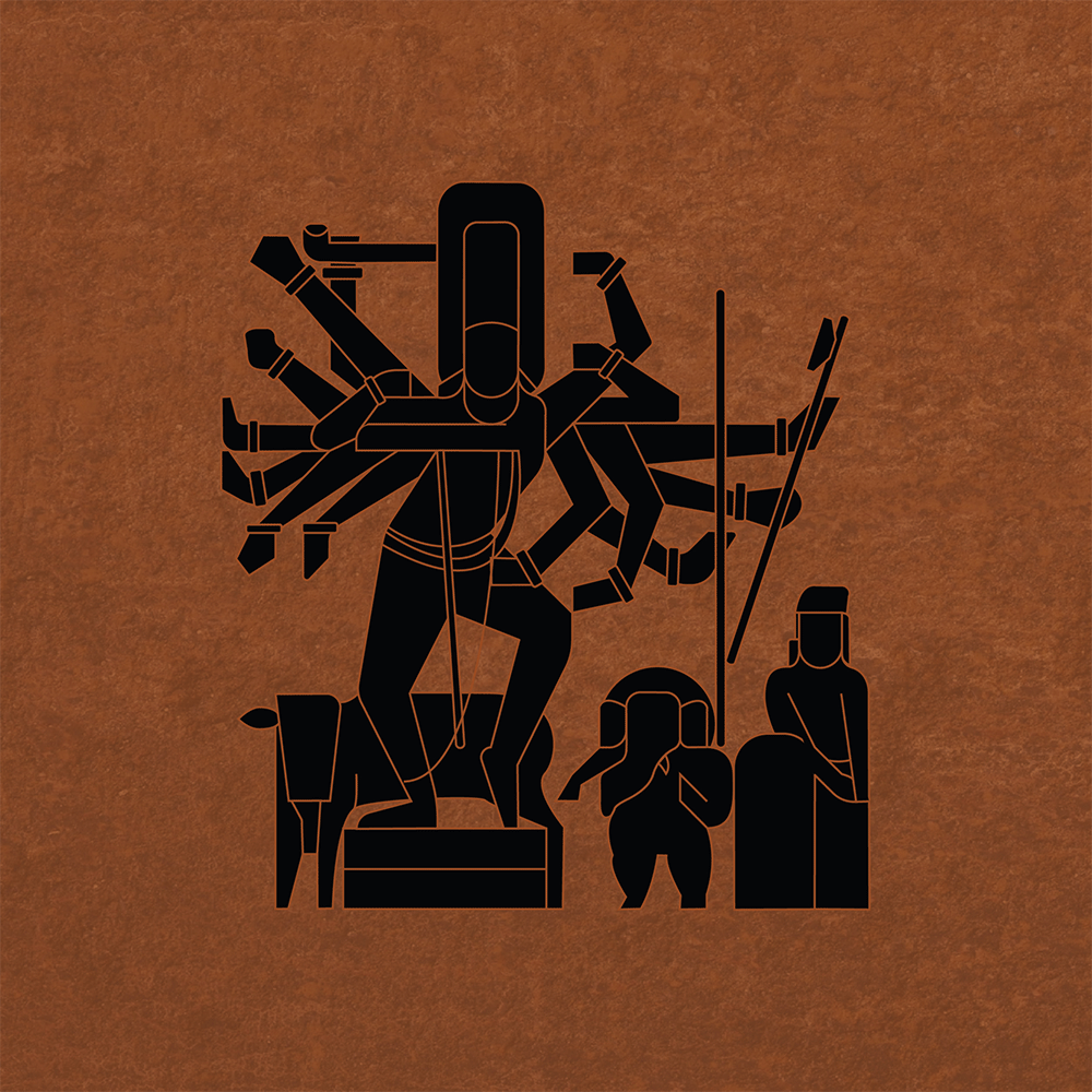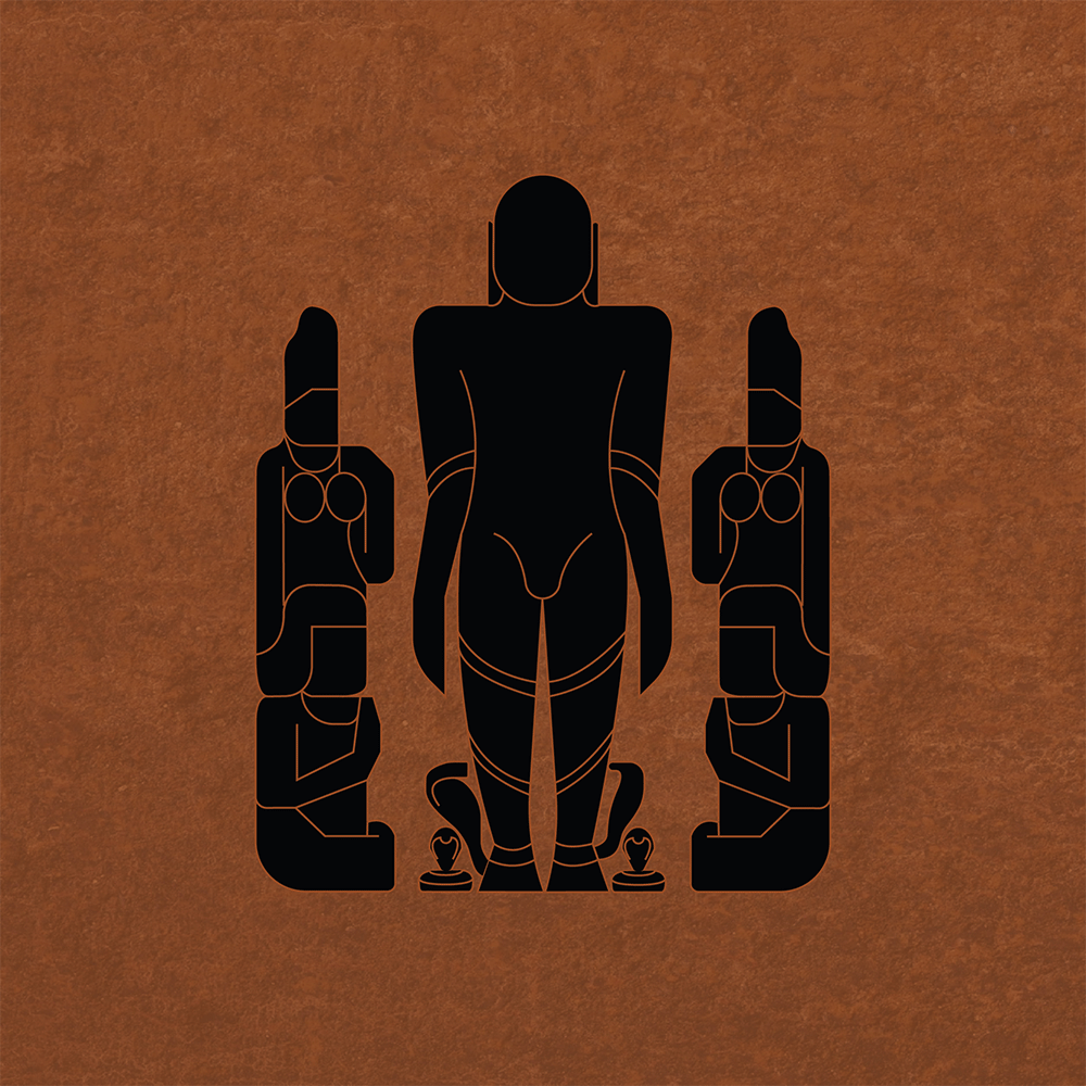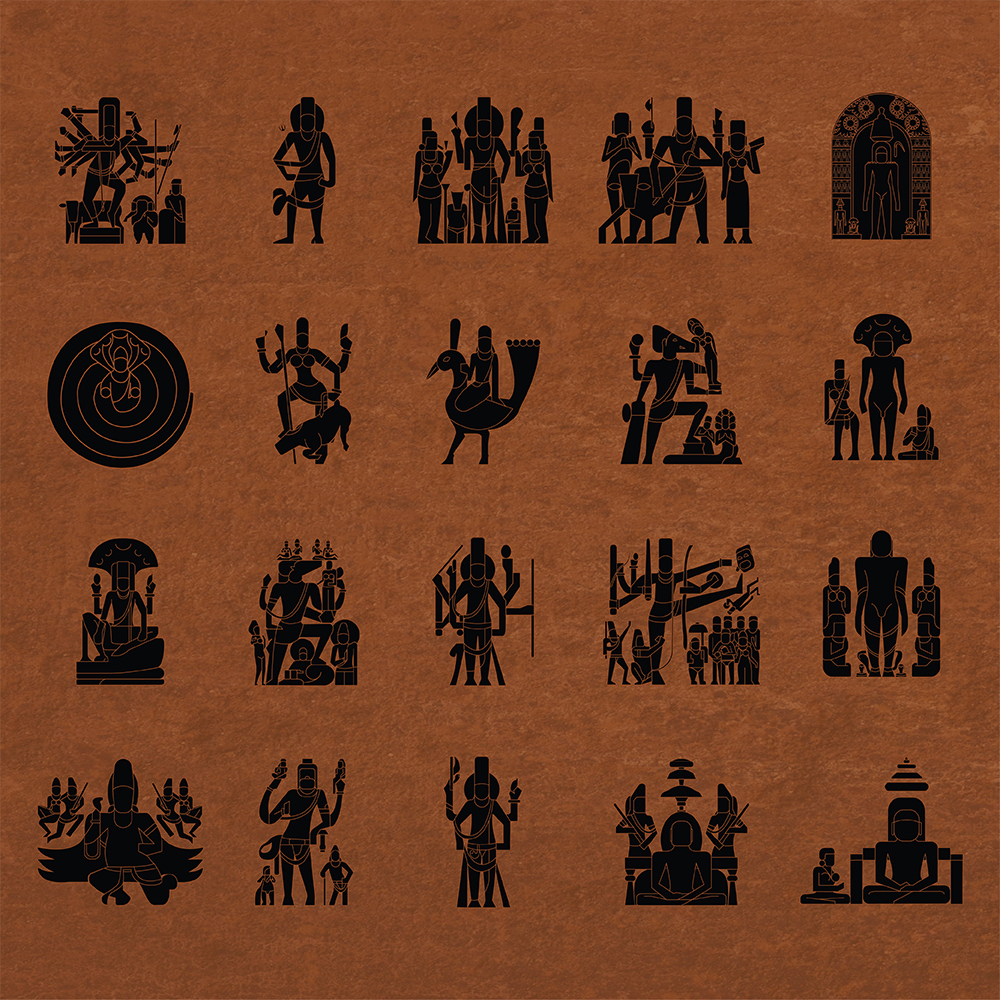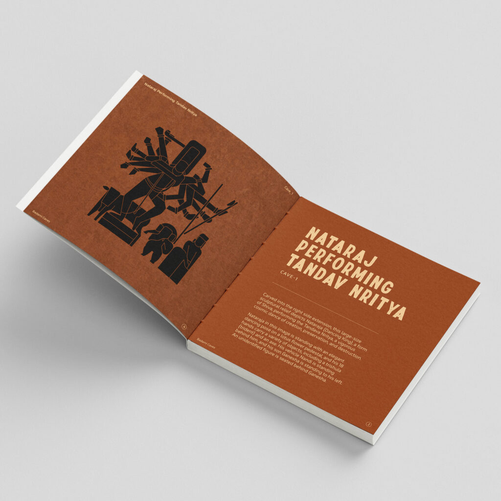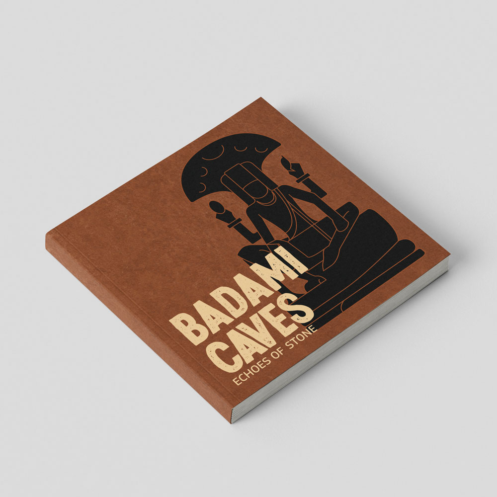 This infographic uses a minimal silhouette illustration style inspired by the stone carvings and relief sculptures found inside the caves. Bold black forms represent mythological figures and temple elements, simplifying complex carvings into clear visual symbols. The reddish-brown background reflects the natural sandstone cliffs of Badami, creating a strong visual connection between the design and the historical environment of the caves.