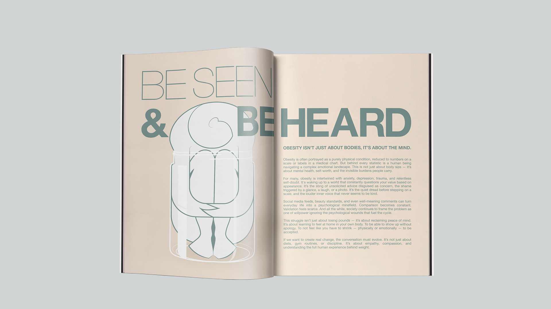 This editorial magazine spread, titled “Be Seen and Be Heard,” addresses the sensitive issue of body shaming and obesity through a conceptual and empathetic visual narrative. The design focuses on the emotional impact of societal judgment, where individuals often feel silenced, isolated, and unseen despite being physically present.