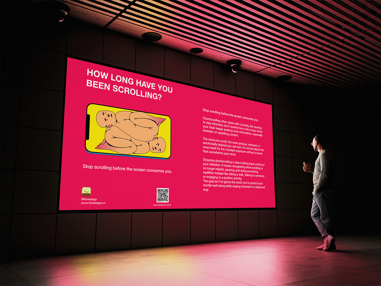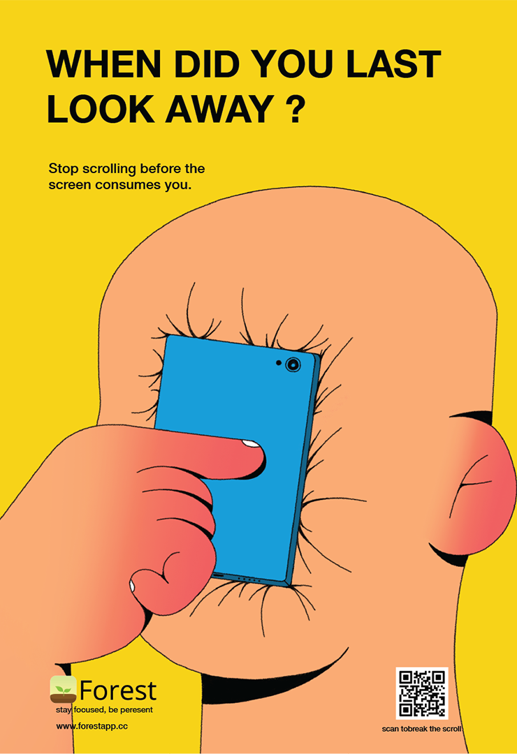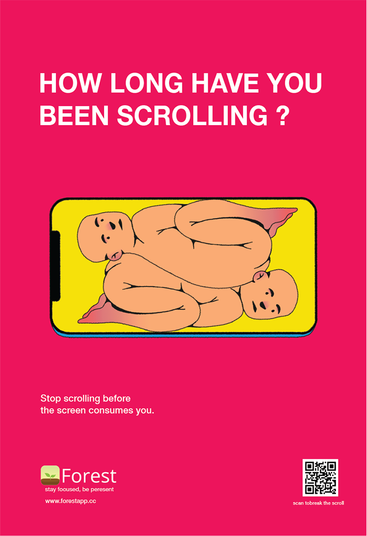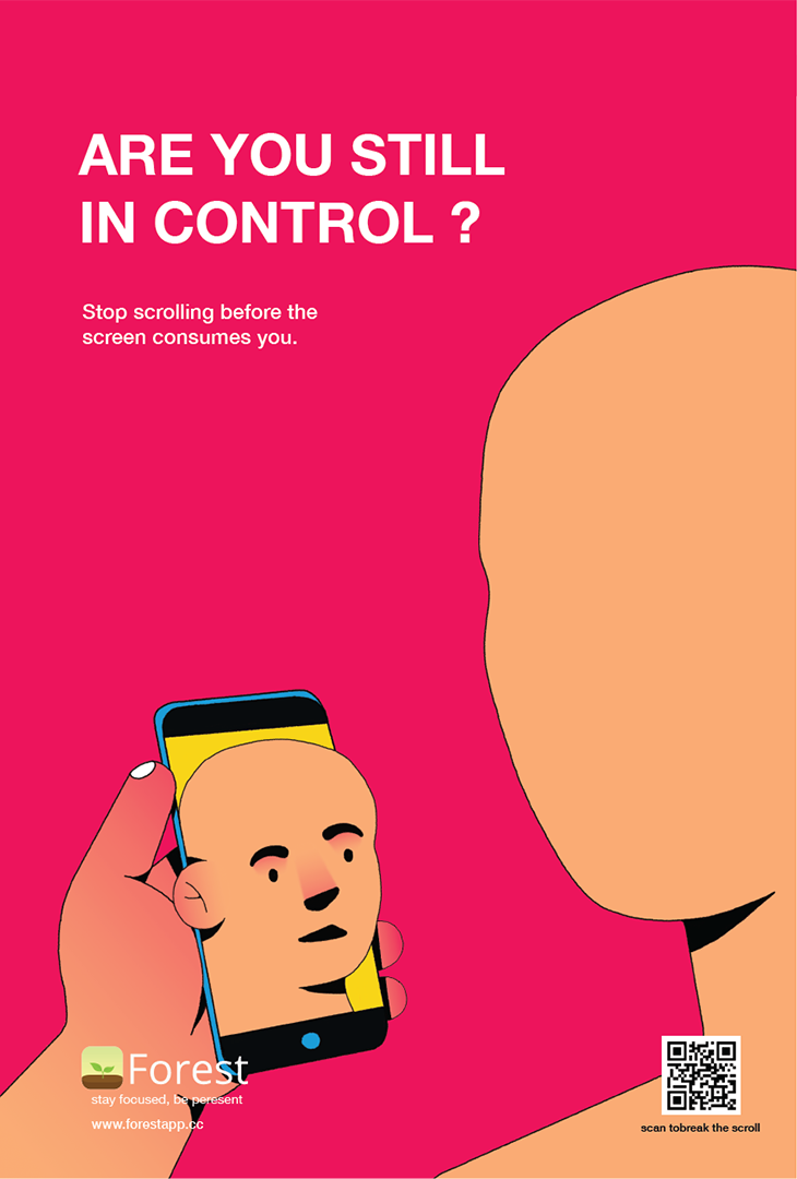 A habit where scrolling becomes continuous and almost unconscious. It begins subtly just a few minutes of scrolling that slowly stretch into hours. The thumb keeps moving, content keeps changing, but nothing is truly absorbed. Gradually, the screen pulls closer, attention narrows, and the outside world fades into the background. Even when there is an urge to stop, the loop continues. Over time, this constant consumption leads to mental fatigue, loss of focus, and a sense of disconnection. The work captures this quiet shift, where control slips away and the digital space begins to dominate everyday experience. Through a minimal and bold visual language, the project invites viewers to pause and become aware of their own screen habits.