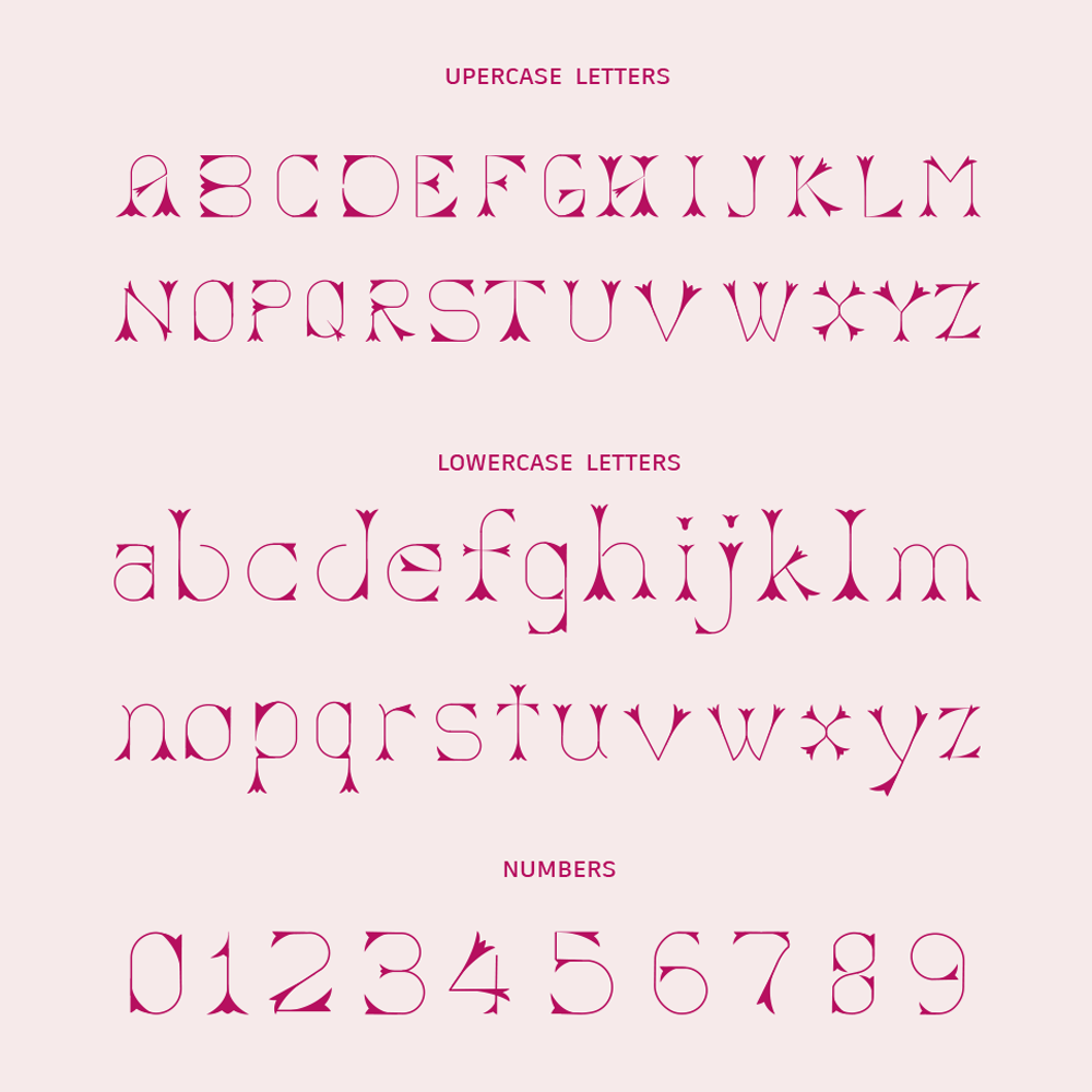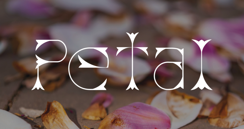 This display font is inspired by the delicate petals of flowers and the organic shapes found in nature. The ends and curves of each letter are designed with petal-like forms, giving the characters a soft, artistic, and decorative appearance. Because of these floral elements, the font reflects the beauty of nature and creates an elegant and creative visual style.