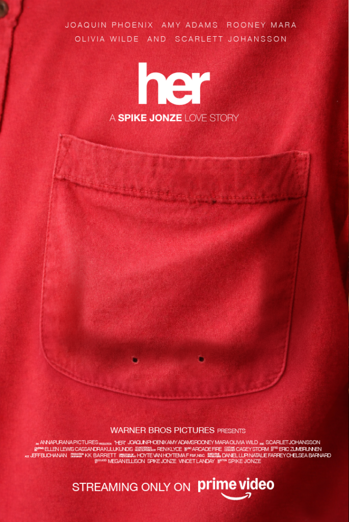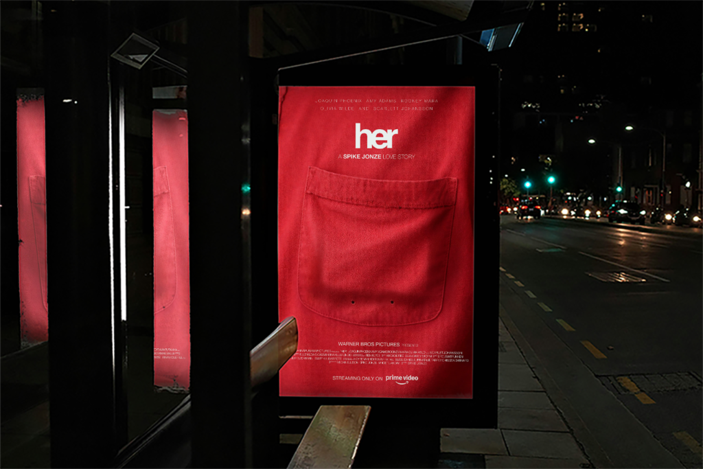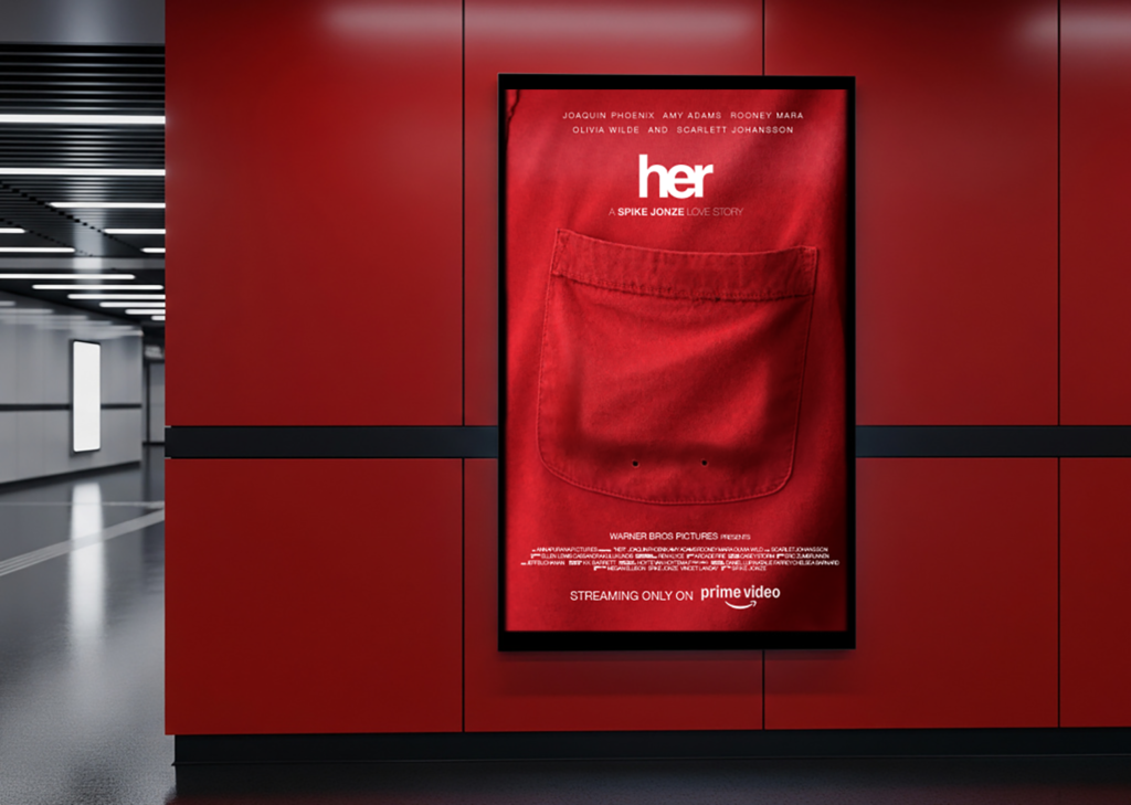 This movie poster design for “Her” is based on a conceptual interpretation of the film’s themes of loneliness, intimacy, and the evolving relationship between humans and technology. The design focuses on the emotional paradox of feeling deeply connected to something intangible, highlighting the idea of presence without physical form.
