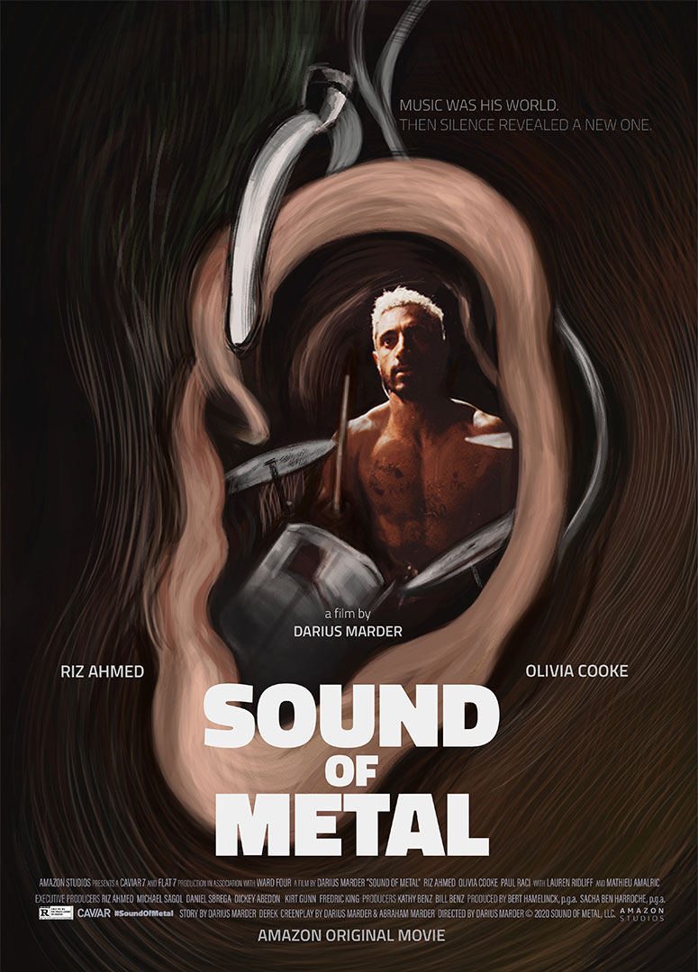 Typography is treated as an expressive element, breaking or fading to mirror the protagonist’s shifting perception of reality. The color palette leans toward muted tones, reinforcing a sense of introspection and detachment, while selective highlights draw attention to moments of realization and acceptance. Overall, the poster translates the film’s deeply personal journey into a visual narrative—capturing not just the loss of hearing, but the discovery of a new way of experiencing the world.
