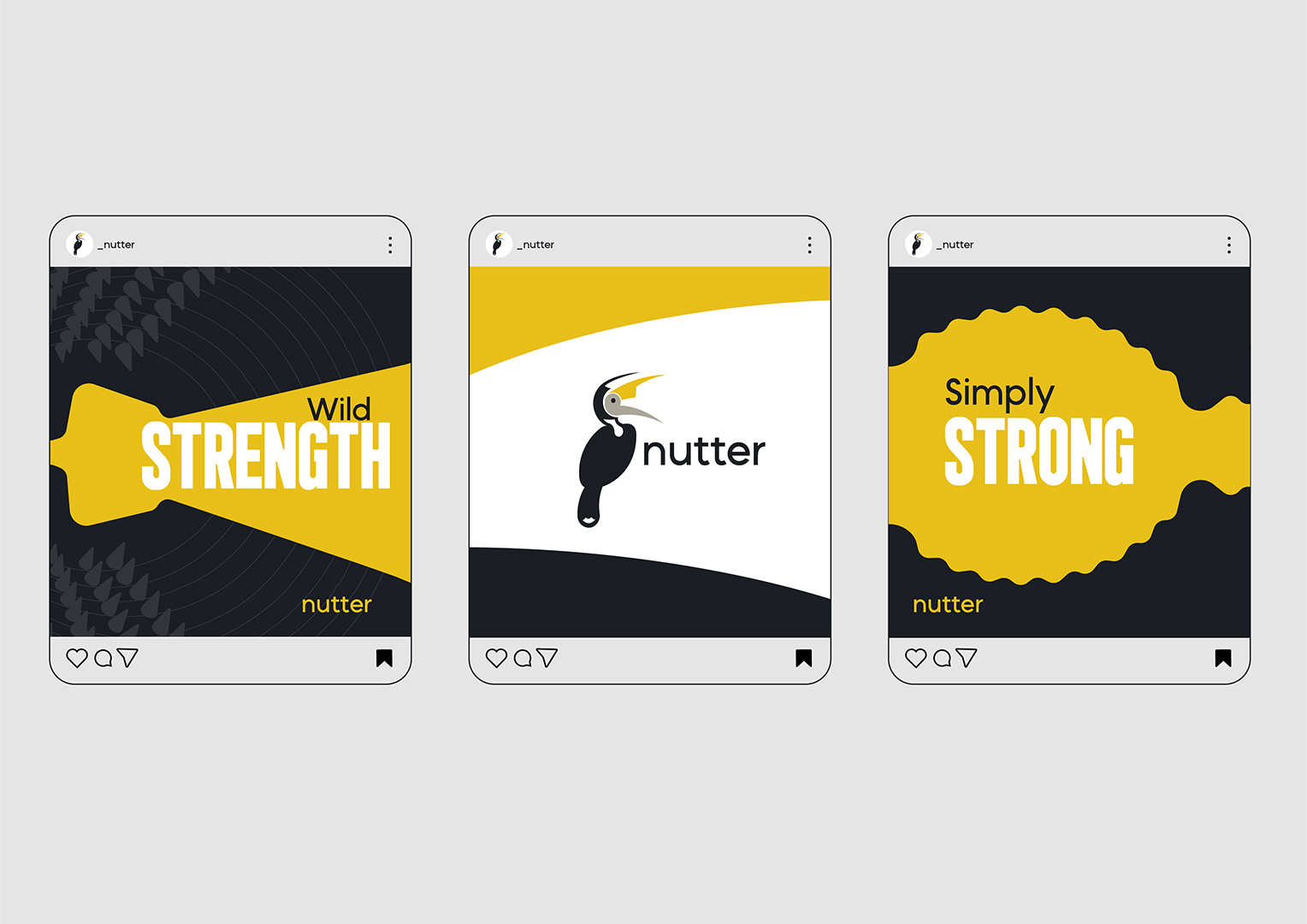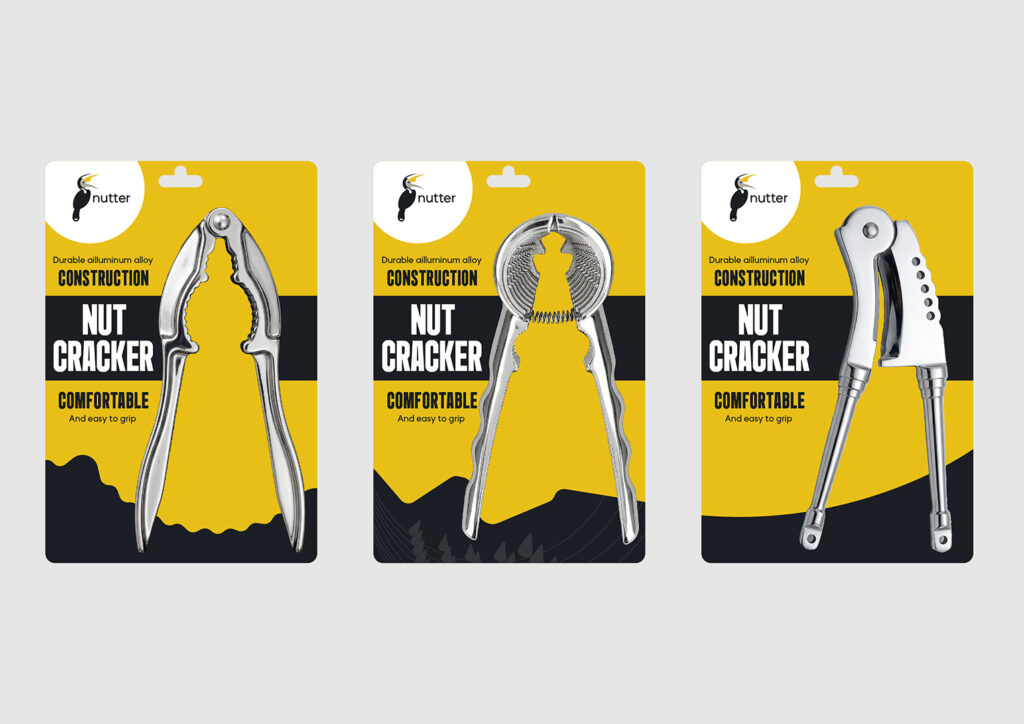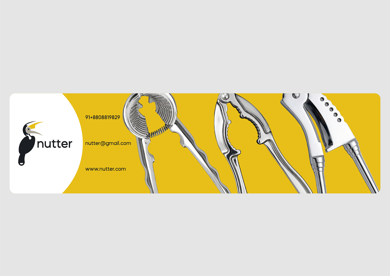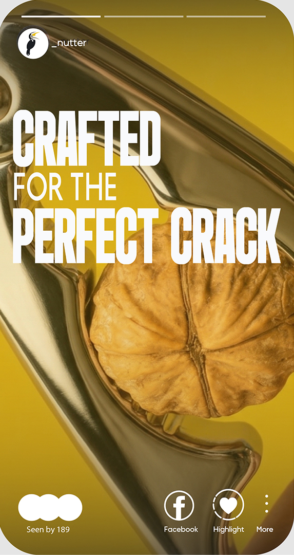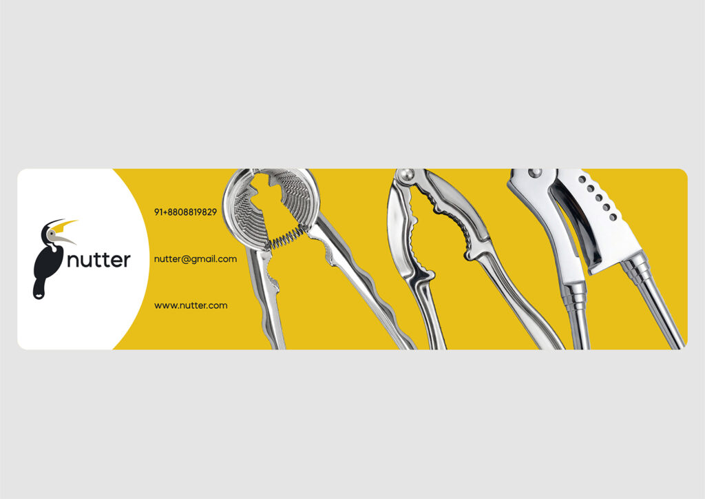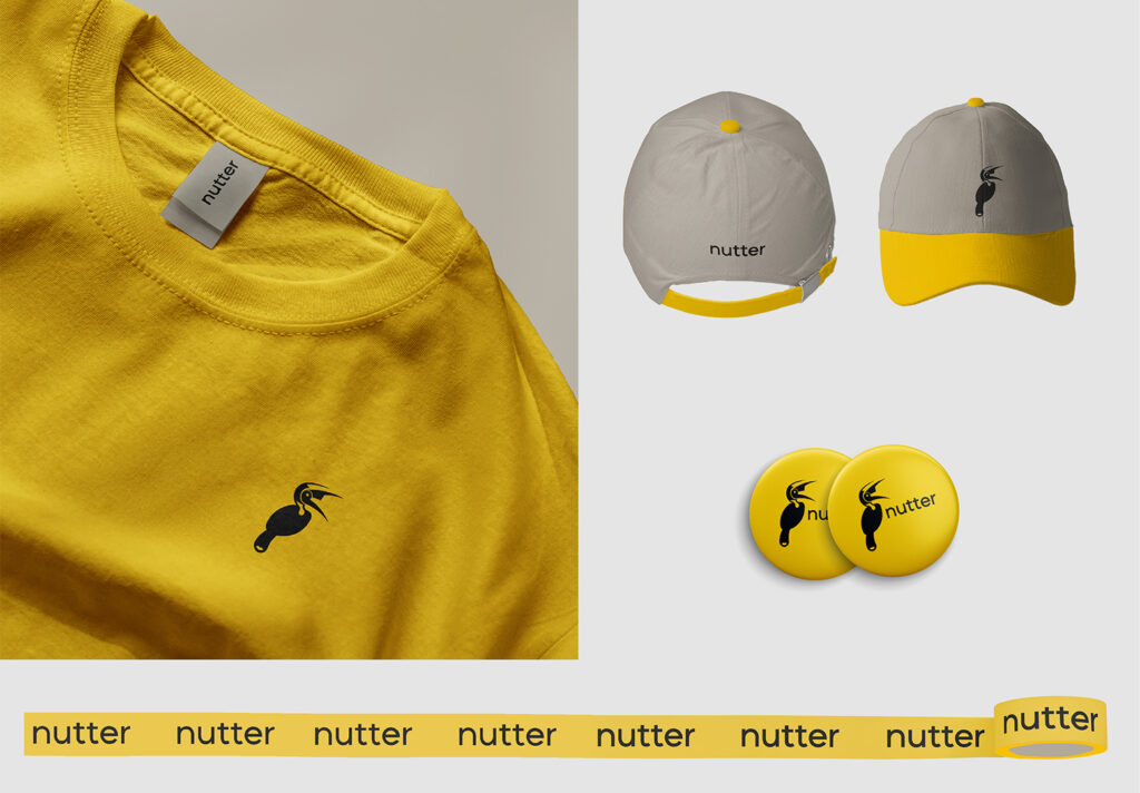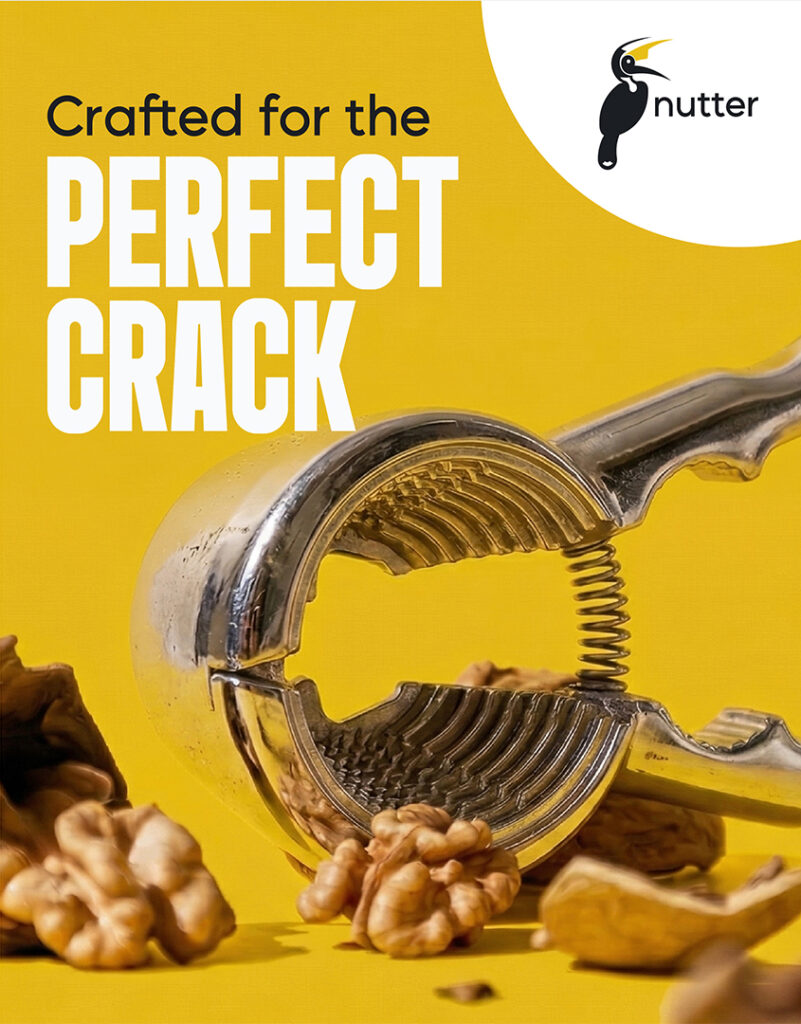 NUTTER is a premium nutcracker brand that represents sharp performance and high-quality craftsmanship. The logo combines a hornbill and an adkitta (traditional nutcracker tool) to create a distinctive identity. The hornbill was chosen for its natural ability to crack nuts with its strong beak, which also resembles the shape of an adkitta. Commonly found in the Konkan region, it is known for its long, sharp beak-perfectly reflecting the brand’s focus on precision and strength. The color palette reinforces this concept, with dark grey