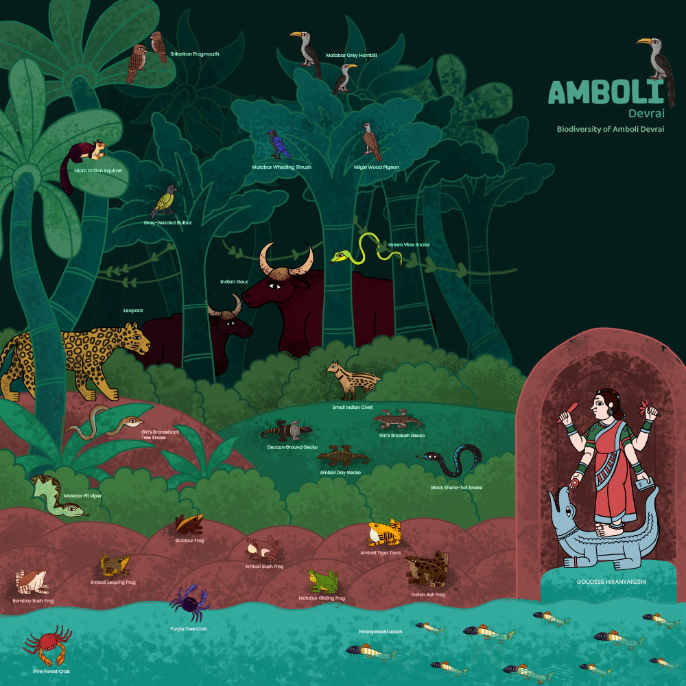 Amboli is a dense evergreen forest located in the Sindhudurg district of the Western Ghats, Maharashtra,known for its rich biodiversity shaped by its humid climate.A Devrai is a traditional practice in the Konkan region, where forests are preserved as sacred groves in the name of a deity. Amboli Devrai is one such sacred grove. It is also the origin of the Hiranyakeshi River, adding to the ecological significance of the region. The area supports a wide range of fauna, including reptiles, amphibians, insects, birds, and small mammals, making it an important ecological hotspot in India.This work illustrates the faunal biodiversity of Amboli Devrai, drawing inspiration from the traditional Chitrakathi folk art of Pinguli. The information is presented in a simple and accessible way, making it easier to understand, while bringing together the ecological and cultural diversity of the region.