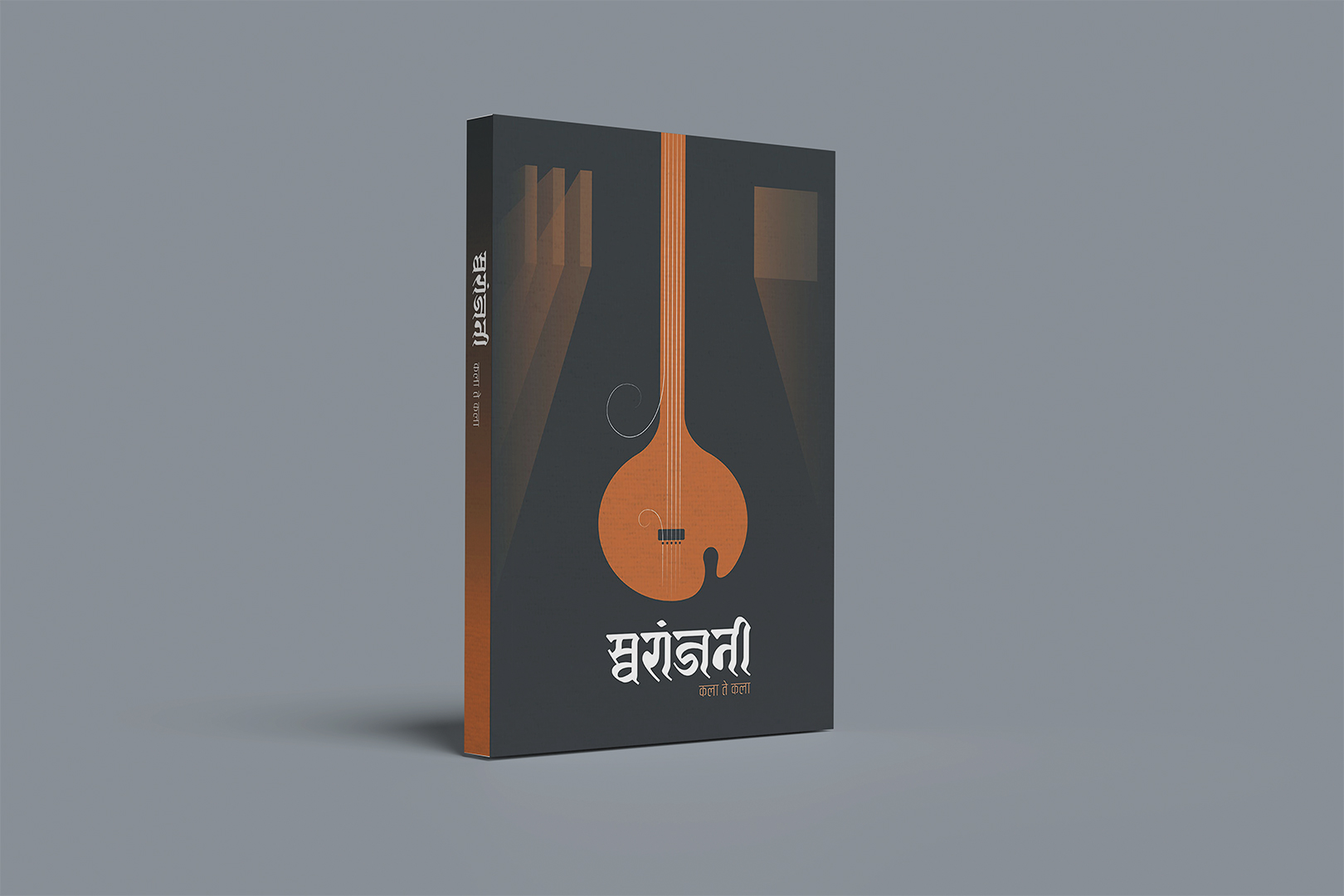 This book cover design is a contemporary interpretation of classical Indian music, using minimal yet symbolic visual language. The central element is a stylized form of a traditional string instrument, seamlessly integrated into the layout so that it becomes both a visual anchor and a narrative device. The elongated vertical composition draws the viewer’s eye from top to bottom, mimicking the flow of musical rhythm. The use of a warm ochre-orange against a deep muted grey creates a strong contrast, evoking both cultural richness and modern sophistication. Subtle textures and gradients add depth while maintaining a clean, editorial aesthetic. The typography, especially the Devanagari title, is treated with prominence and elegance, reinforcing the cultural context of the subject. The back cover continues the visual story with a simplified silhouette of the instrument, ensuring continuity across the entire book jacket. Overall, the design balances tradition and modernity, visually communicating the essence of music as both an art form and an emotional journey.