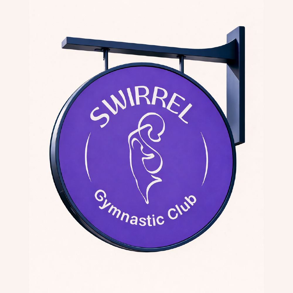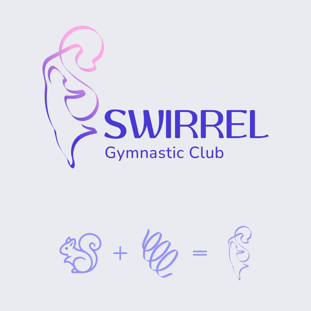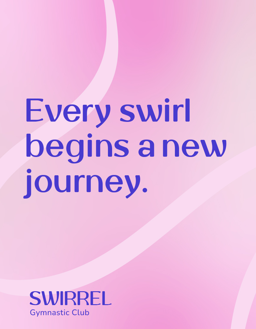 Swirrel Gymnastic Club is a rhythmic gymnastics club where children are trained in movement, balance, and co-ordination, using props like ribbons to develop flexibility, control, and rhythm.The brand is inspired by a squirrel’s playful agility and quick, flowing movements. The name Swirrel combines ‘swirl’ and ‘squirrel’, reflecting this rhythm, while the ribbon expresses it through smooth, continuous motion, where every movement begins to flow.Purple-blue and pink reflect energy and grace. Rounded typography, with thick and thin strokes, follows a flowing movement inspired by the ribbon.