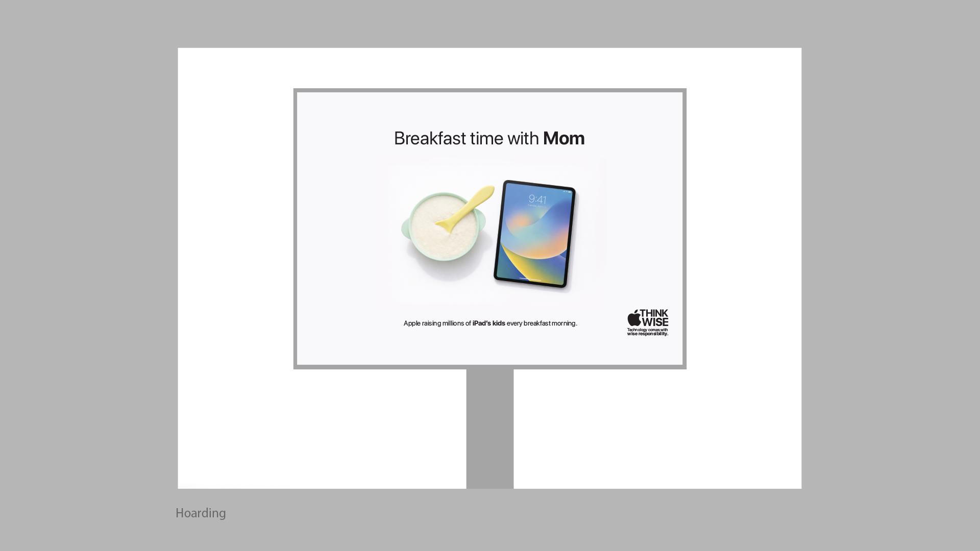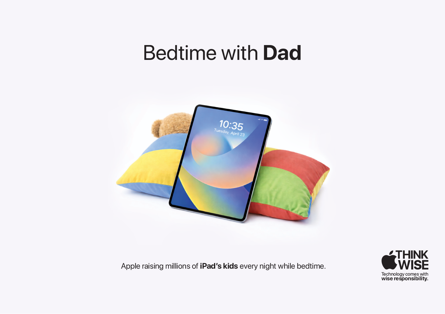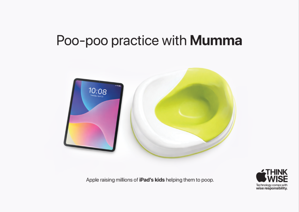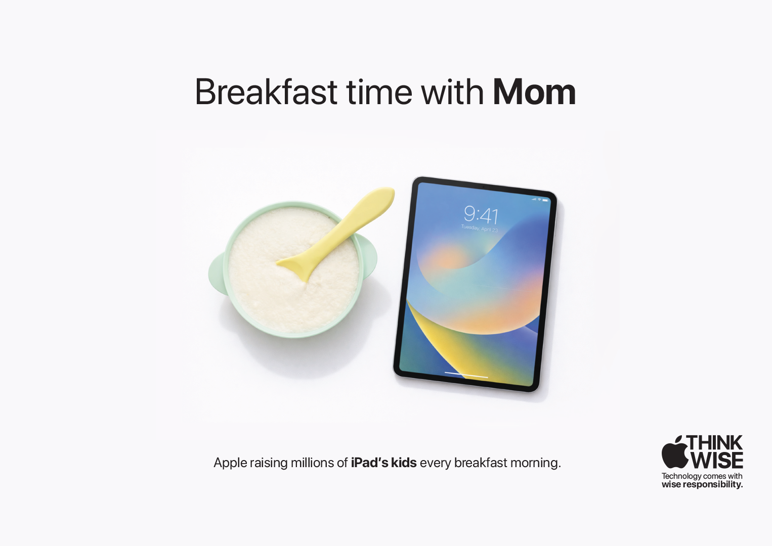 “Think Wise is an expandable campaign in which Apple, as a tech brand, shares knowledge about the wise use of technology. It uses reality-questioning lines like ‘Breakfast time with mom?’ supported by minimal visuals on a white background. These visuals depict situations—such as feeding, sleeping, day outings, and even potty time—where parents are absent, subtly personifying the iPad as a parent.”