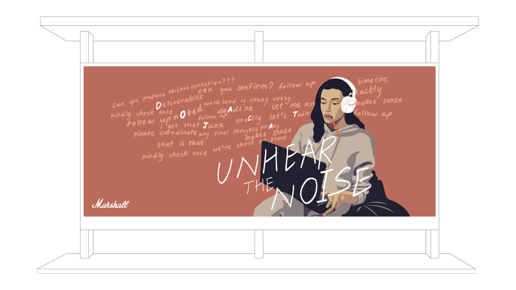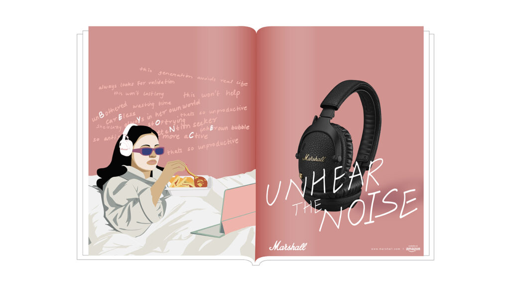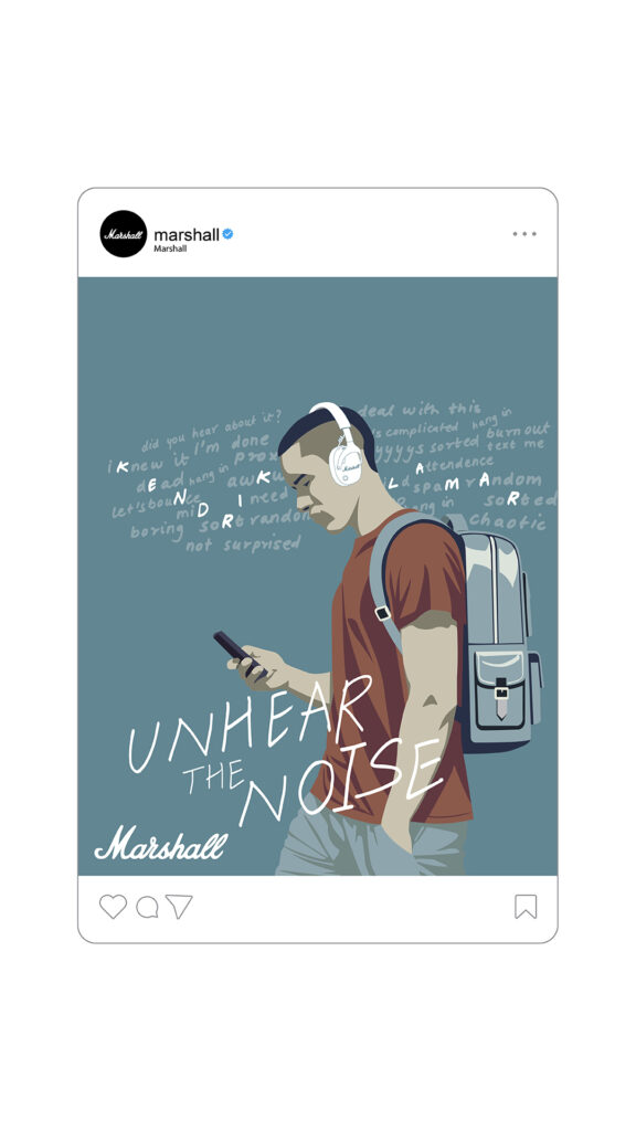 The “Unhear the Noise” campaign by Marshall headphones addresses the overwhelming mental clutter of modern life—judgment, criticism, and constant social distractions that impact emotional well-being. The idea positions music as a powerful escape, where artists help individuals disconnect from negativity and reconnect with themselves. Rooted in Marshall’s deep association with live music culture, the campaign transforms unwanted external noise into a curated emotional experience, creating a personal space that is immersive, expressive, and freeing—crafted by artists, for individuals seeking clarity and calm within chaos.