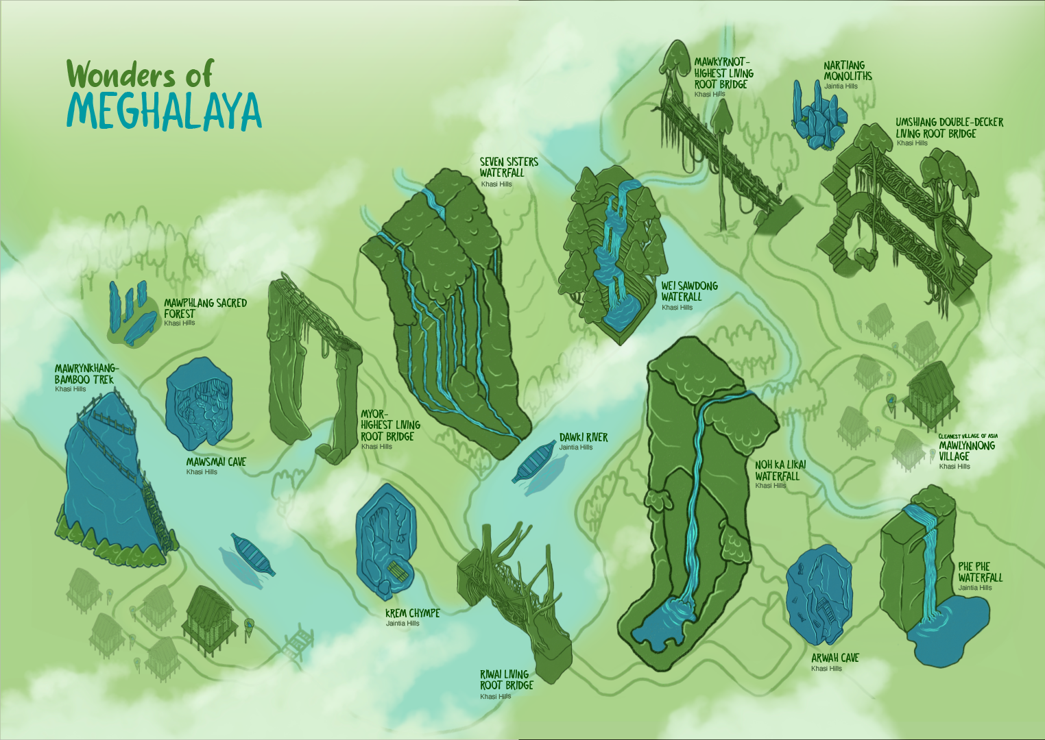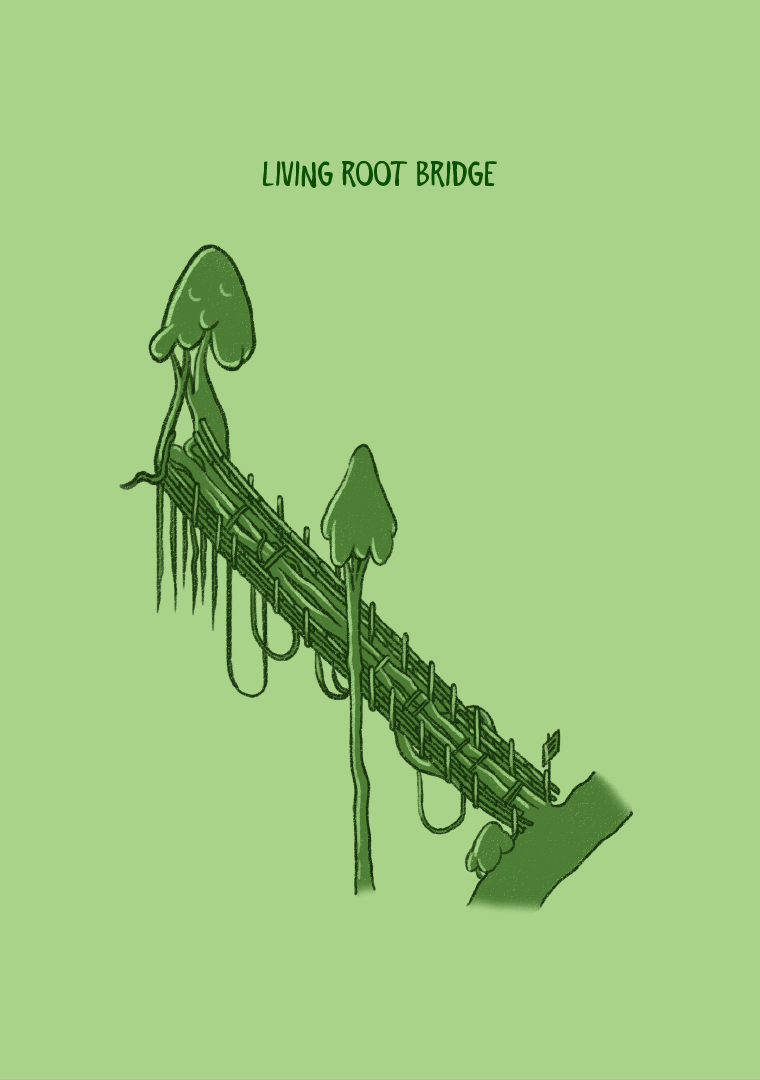 This project focuses on creating a cohesive set of infographic icons representing Meghalaya’s key natural and cultural landmarks, including living root bridges, waterfalls, and traditional structures. The illustrations follow a simplified, isometric approach to ensure clarity while retaining recognizability.